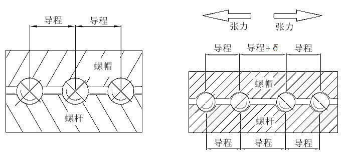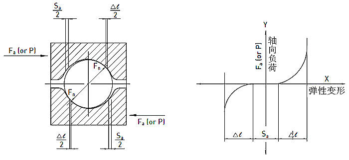 獨(dú)特的哥德式牙型珠槽能產(chǎn)生大約45°的鋼珠接觸角。由外部動(dòng)力及內(nèi)部預(yù)壓力產(chǎn)生軸向力Fa能產(chǎn)生兩種背隙。一種是鋼珠與珠槽之間制造所產(chǎn)生的正向背隙Sa。另一種是由垂直于接觸點(diǎn)的正向力Fn所產(chǎn)生的彈性變形△L。制造所產(chǎn)生的背隙能由內(nèi)部預(yù)壓力P消除,此種預(yù)壓力可藉由雙螺帽、偏移節(jié)距的單螺帽或以鋼珠大小調(diào)整預(yù)壓的單螺帽產(chǎn)生。彈性變形是由內(nèi)部預(yù)壓力和外部負(fù)荷產(chǎn)生進(jìn)而造成失步效應(yīng)。